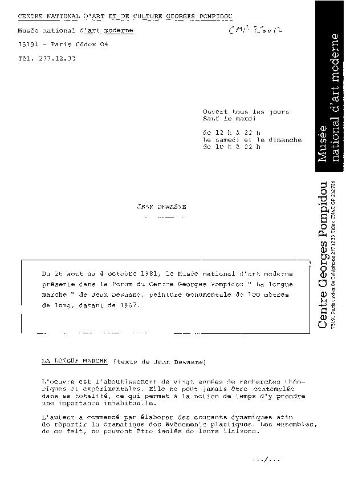 Elle ne peut jamais être contemplée dans sa totalité, ce qui permet à la notion de temps d’y prendre une importance inhabituelle. […] Le spectateur dégagera lui-même des couples, des constellations, des configurations, du tissu des messages plastiques."