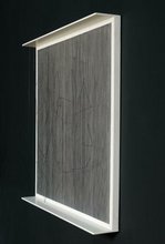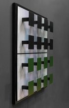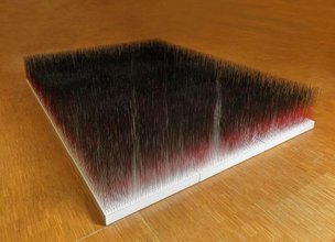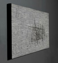 Sur un fond carré noir, strié de lignes blanches peintes à la main, de fines formes métalliques en fil de fer coudé à angle aigu ou en arcs de cercle, peintes en noir, sont suspendues par des fils de Nylon transparents de différentes longueurs. Disposés tout le long de la surface tramée, ces éléments composent une calligraphie à la fois libre et rigoureuse, en perpétuelle tension et en parfait équilibre. Au moindre souffle, au plus petit déplacement du visiteur, ils bougent, la surface s’anime et la composition se met à vibrer. Les formes deviennent instables, apparaissant ou disparaissant au fur et à mesure que le regard du spectateur se déplace.