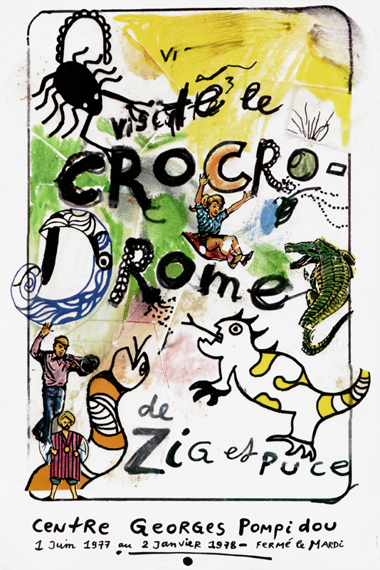En ce début 1977, alors que le tout nouveau Centre Pompidou ouvre enfin ses portes dans le quartier Beaubourg après des années de travaux, un étrange monstre de ferraille et de plâtre accueille les publics dans le Forum central. Long d'une trentaine de mètres, Le Crocrodrome de Zig & Puce est une créature hybride, tout droit sortie du cerveau d’un duo d’artistes hors du commun, Niki de Saint Phalle et Jean Tinguely. L'artiste suisse a griffonné de nombreux plans de cette attraction loufoque, qu'une note du projet, rapportée par Bernadette Dufrêne dans le catalogue de l’exposition, décrit comme « un édifice mi dragon, mi navire, mi caverne, mi palais ». Pendant de longues semaines, le public assiste, médusé, à sa construction, assemblage de matériaux hétéroclites.