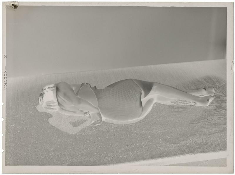 Portrait de Meret Oppenheim, allongée sur un sol de sable