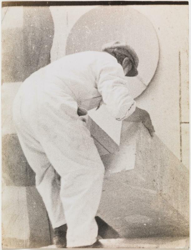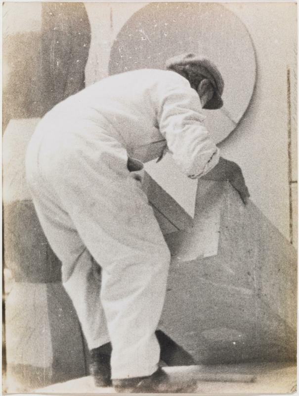 Brancusi, monté sur une table, déplaçant un bloc : installation de la...