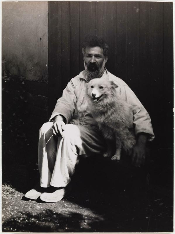 Autoportrait avec la chienne Polaire devant l'atelier