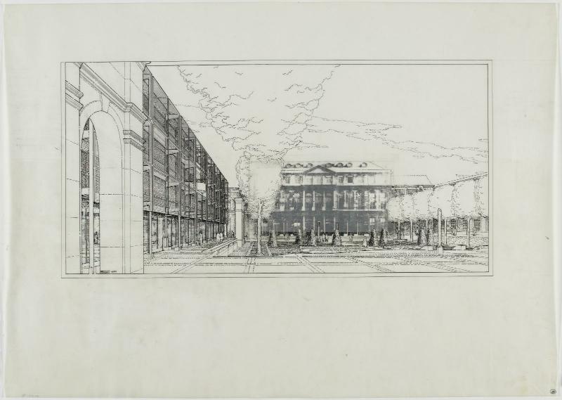 Perspective d'ensemble, vu côté jardin, rapport entre façade sud et...